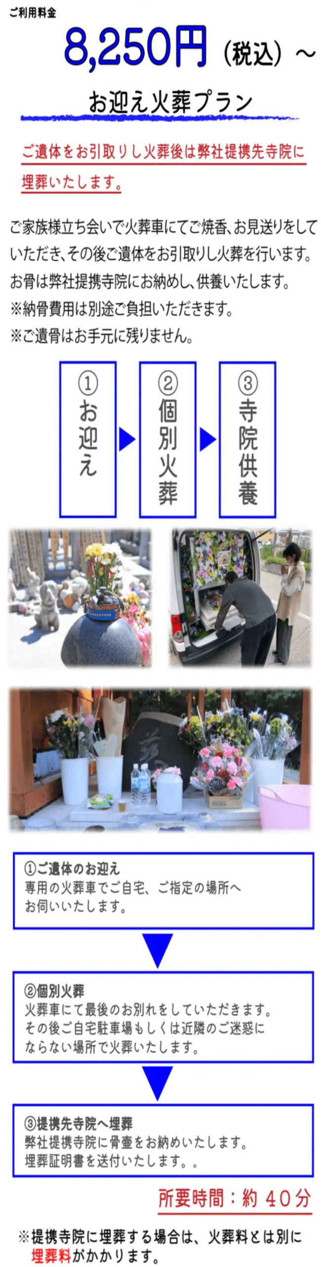 | 料金 | 8,250円 (骨壷・骨袋含む) | 9,000円 (骨壷・骨袋別途) | 11,900円 (骨壷・骨袋含む) |