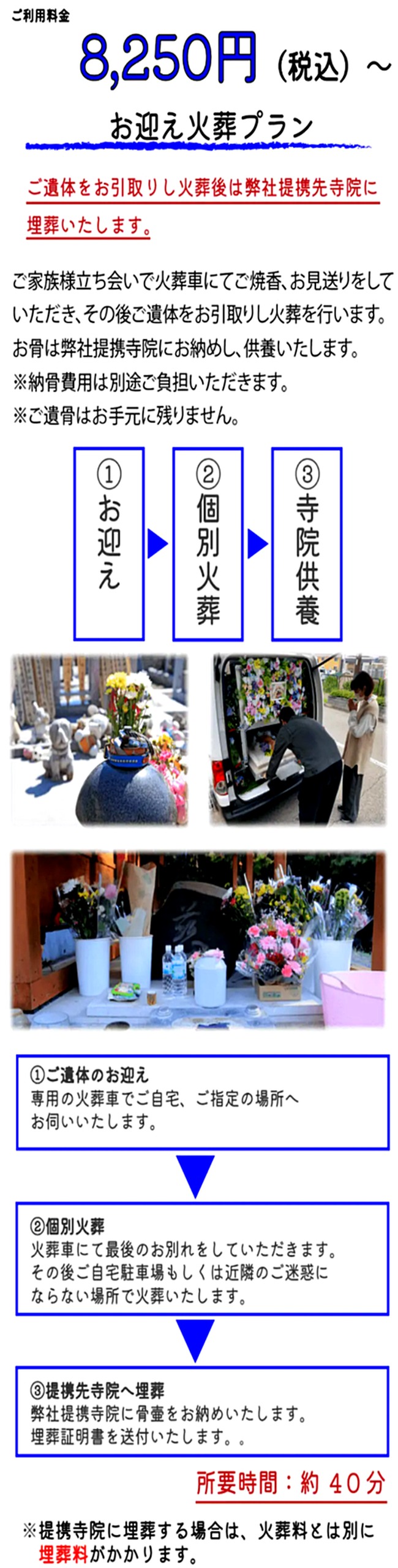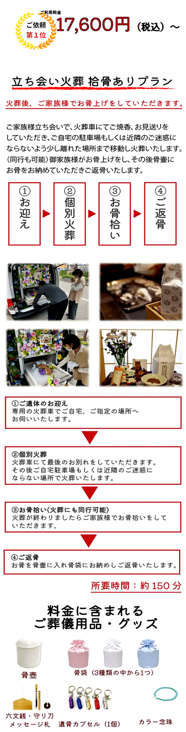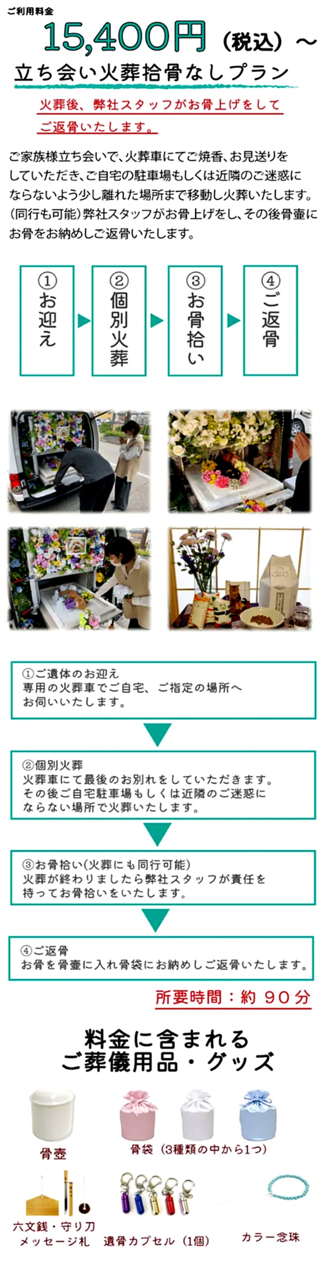 | 料金 | 8,250円 (骨壷・骨袋含む) ※おまかせ火葬は除く | 9,000円 (骨壷・骨袋別途) | 11,900円 (骨壷・骨袋含む) |